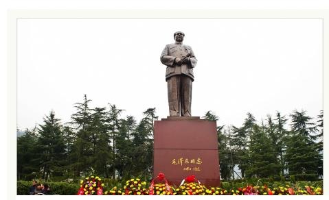 毛泽东铜像位于韶山毛泽东纪念馆大门前80米处,像区占地5200平米。是经中共中央批准兴建的纪念毛泽东一百周年诞辰重点献礼工程。铜像重3.7吨,像高6米,基座高4.1米,通高10.1米,象征着“10.1”国庆,更象征着毛泽东是新中国的缔造者。铜像面朝东南方,身着中山装,左胸前挂着“主席”证,手执文稿,目光炯炯,面带微笑,正视前方,巍然挺立,成功地再现了人民领袖毛泽东出席开国大典时的风采。铜像褐红色大理石基座正面,镌刻着前中共中央总书记、国家主席、中央军委主席江泽民题写的“毛泽东同志”五个贴金大字。